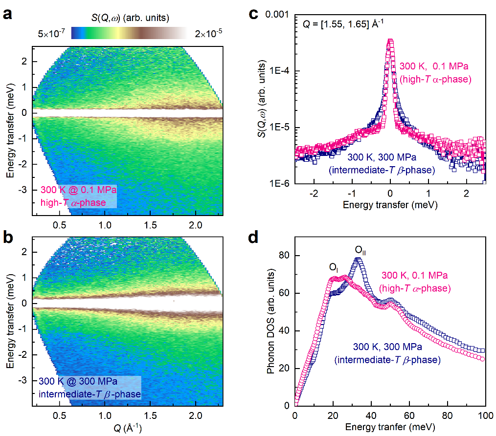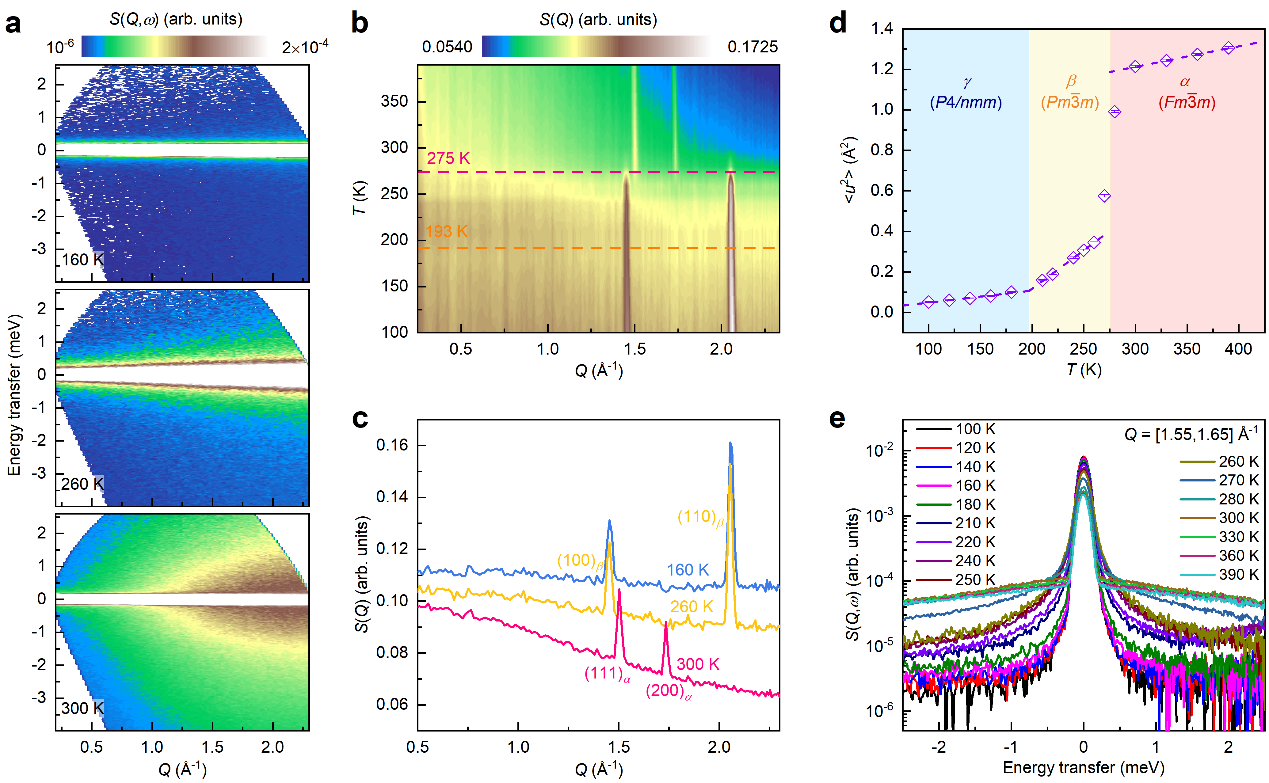 图2. NH4I化合物中的相变与晶格动力学行为。a, 非弹性中子散射测量的三个不同相变区间的动力学结构因子;b,c, 弹性能量区间获得的衍射谱随温度的变化; d, 原子均方位移在不同相区间表现出不同的温度依赖性; e, 不同相变区间准弹性展宽。