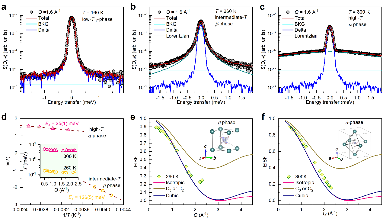 图3. 准弹性中子散射(QENS)数据分析:铵基分子在γ相中处于有序态;在β相中存在较慢的取向无序运动,且激活能较大;而在α相表现出更快的取向无序运动,激活能较小。
