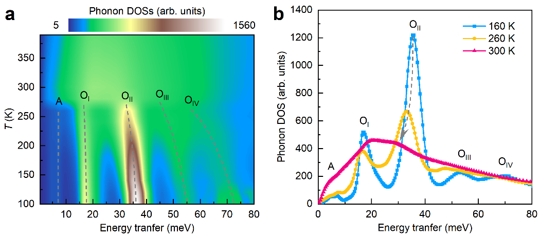 图4. 通过中子散射测得的声子态密度随温度的变化,揭示出很强的声子非谐效应。