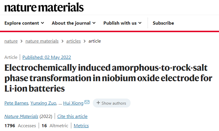 美国博伊西州立大学熊晖与美国加州大学圣地亚哥分校Shyue Ping Ong课题组合作,报告了一种纳米结构的岩盐Nb2O5电极,该电极是在与Li+重复电化学循环过程中通过非晶向晶体的转变而形成的。该电极每Nb2O5可以可逆循环三个锂,在20 mA g-1时具有269 mAh g-1的可逆容量,并在1 A g-1的高倍率下能量密度高达191 mAh g-1。在200 mA g-1下循环400次,容量为225 mAh g-1,库仑效率高达99.93%。本工作将增强的性能归因于立方岩盐框架,它促进了低能迁移路径。本工作表明,通过电化学循环诱导非晶态纳米材料的晶化是创造非常规高性能金属氧化物电极材料的一个很有前景的途径。相关论文以题为:“Electrochemically induced amorphous-to-rock-salt phase transformation in niobium oxide electrode for Li-ion batteries”发表在Nature Materials上。