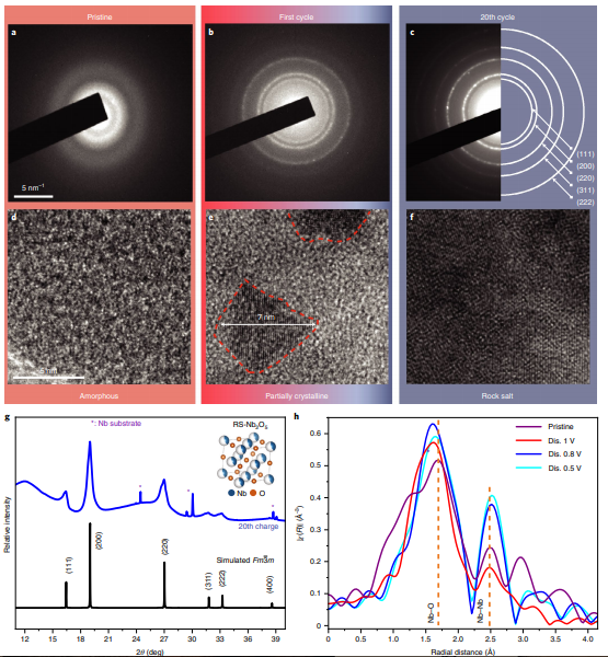 透射电镜、掠入射同步加速器 X 射线衍射和非原位扩展X射线吸收精细结构 (EXAFS) 用于阐明 Nb2O5 的新岩盐相(图3)。首先通过SAED和高分辨率TEM评估3 V和0.5 V之间电化学循环时的相变(图3a-f)。原始样品在SAED中呈现出漫射环(图3a),与在高分辨率TEM中观察到的无定形特征一致(图3d)。SAED 图案在第一个循环后开始锐化(图3b),表明在无定形基质内形成了纳米微晶(图3e)。第20次循环后,SAED和高分辨率TEM均显示氧化物已完全结晶(图3c,f)。此外,掠入射同步辐射X射线衍射在不同入射角,即探测深度下,样品的峰形和峰位没有明显变化。因此,样品始终保持纳米晶,表明薄膜的均匀性和微不足道的表面紊乱。这进一步说明通过电化学循环得到的新晶态结构相对于其初始非晶结构的性能有所改善。