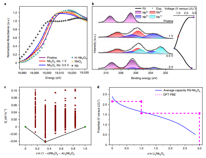 图4. RS-Nb2O5中Nb氧化态的表征;Perdew-Burke-Enzerhof计算的化合物相图;以及LixNb2O5的电压分布 © 2022 Springer Nature