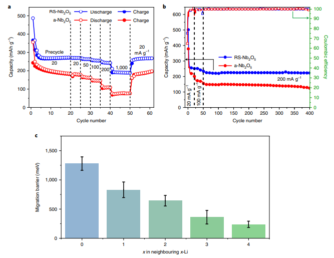图5. RS-Li3Nb2O5迁移势垒的RS-Nb2O5计算和a-Nb2O5样品的电化学性能 © 2022 Springer Nature