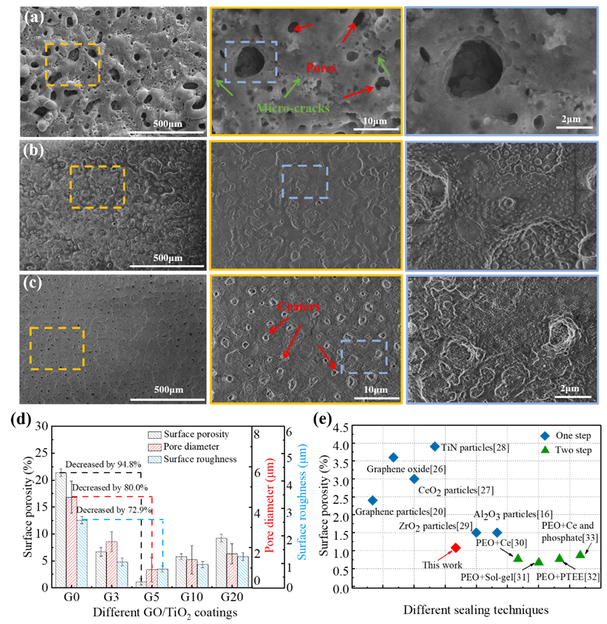 图1. 不同氧化石墨烯添加量膜层表面形貌:(a) 0g/L,(b) 5g/L,(c) 20g/L; (d)不同GO/TiO2涂层的表面孔隙率、孔径和表面粗糙度; (e) 不同表面处理方法的表面孔隙率比较。