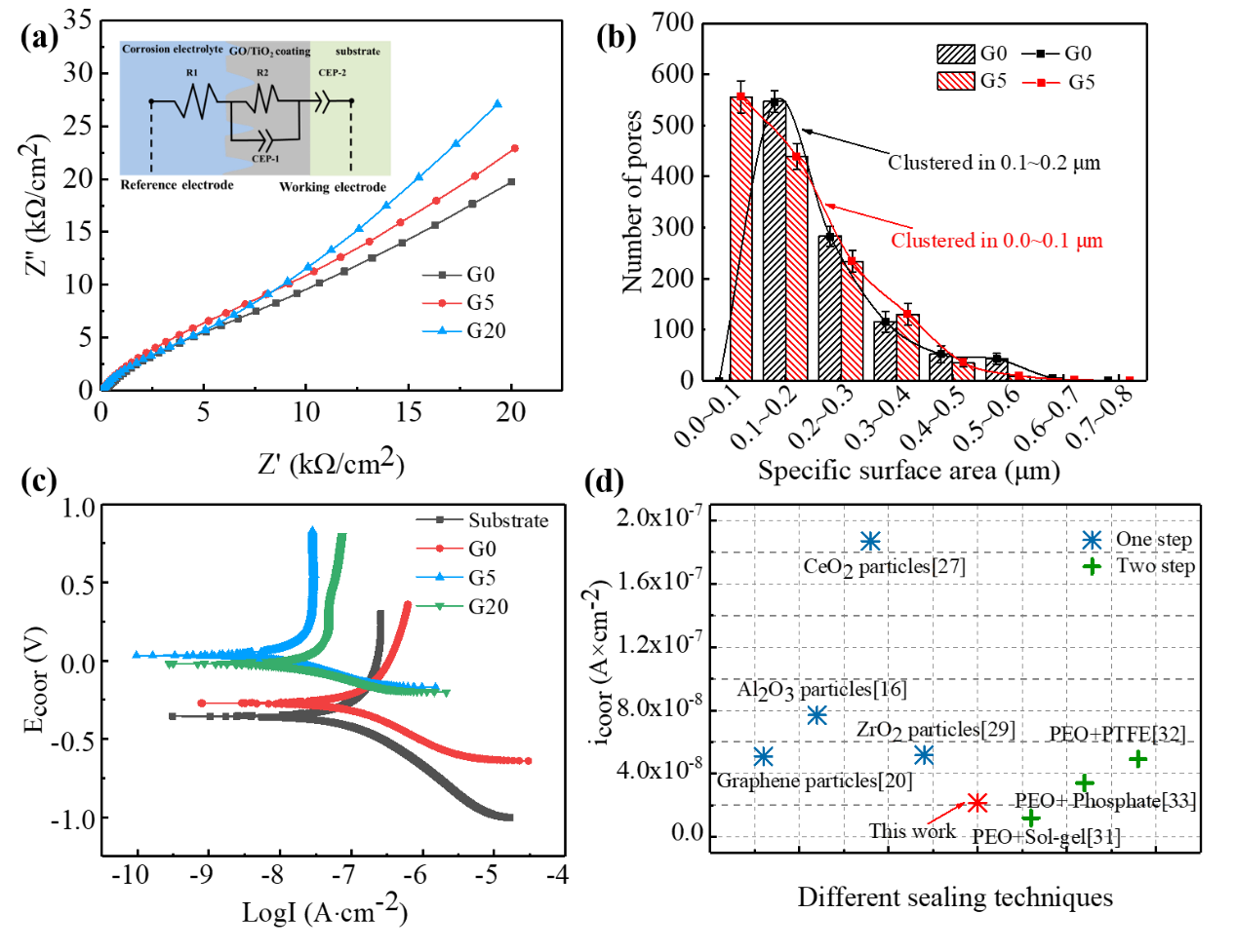 图3. 不同GO/TiO2膜层 (a) Nyquist图,(b) 比表面积图,(c) 动电位极化曲线图。(d) 不同表面处理膜层的电流密度比较。