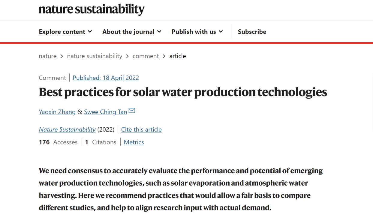 文献链接:Yaoxin Zhang, Swee Ching Tan*, Best practices for solar water production technologies, 2022, Nature Sustainability. DOI: https://doi.org/10.1038/s41893-022-00880-1