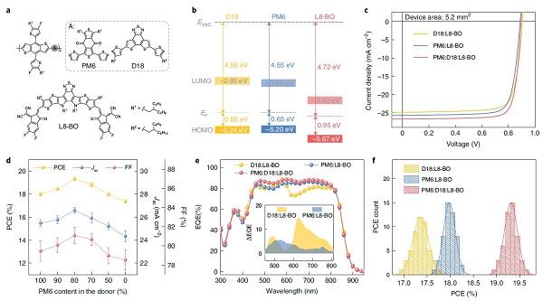 (f)基于D18:L8-BO、PM6:L8-BO和 PM6:D18:L8-BO器件的PCE统计。