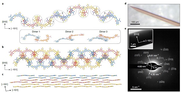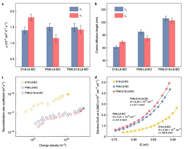 在前期的研究中,刘烽教授团队发现Y6类受体具有特殊的类聚合物堆积形态,并对其进行了一系列分子组装形态与多尺度形貌优化研究。在对Y6分子的结构优化中,通过引入弧外长支化侧链设计出了L8-BO受体。由于加强了烷基侧链间相互作用,调整了L8-BO分子在晶格中的组合序列,使其分子堆积更加紧密。这种特殊的多重分子间作用力,可使多个邻近二聚体交织形成大长径比的组装结构,呈现长周期对称性,并且对局部排列缺陷具有更高的耐受性。因此,L8-BO易形成长针状单晶结构,且可在薄膜沉积中维持大长径比的自组装特性,更易于形成类聚合物的纤维状结构。在此基础上,为了进一步在纳米尺度上对给受体相进行形貌优化以实现高效的激子扩散与载流子传输,上海交通大学刘烽教授、北京航空航天大学孙艳明教授以及帝国理工颜骏博士(共同通讯作者)在PM6:L8-BO的基础上,通过三元策略,引入了较强结晶性的给体聚合物D18,利用辅助结晶方法制备了具有双纤维网络形貌的光吸收层。D18可协同改善给受体纤维的结晶性,平衡给受体端激子和载流子的扩散长度,从而优化器件多维参数适配性。同时,D18还可以促进共混体系形成更密集的双纤维网络结构(纤维间隙中的共混相特征尺寸约为5 nm),能更好地与激子、载流子的扩散能力匹配,降低复合常数。此外,密集的给受体纤维交织形成了电子和空穴传输的高速通道,保证解离后的载流子能快速扩散到相应电极,最终大幅提升了器件效率。基于PM6:D18:L8-BO的有机太阳能电池最高效率达到了19.6%,填充因子接近82%,并获第三方独立机构的效率认证(NPVM:19.2%),是目前有机太阳能电池单结器件报道的最高值。最后,研究团队总结了构筑双纤维形貌结构的材料选择原则并验证了其普适性,实现了有机光伏薄膜形貌特征尺度与光物理核心参数的匹配适应,为后续高效有机太阳能电池的设计制备提供了新思路。上交大博士后研究员朱磊,博士生张明、徐锦秋为本文共同第一作者,研究成果以 “Single-junction organic solar cells with over 19% efficiency enabled by a refined double-fibril network morphology”为题发表在国际著名期刊Nature Materials上。