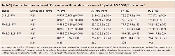 表一、OSCs的光伏参数(辐照为AM 1.5G,100 mW cm–2)