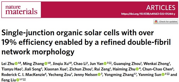 文献链接:Single-junction organic solar cells with over 19% efficiency enabled by a refined double-fibril network morphology, Nat. Mater., 2022, DOI: 10.1038/s41563-022-01244-y.