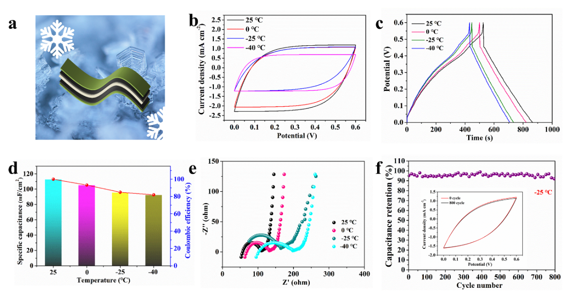 最后,我们将制备的MXene/CMC薄膜电极和PVA/LiCl水凝胶电解质组装成柔性超级电容器。由于PVA/LiCl水凝胶对电极具有优异的自粘附性,PVA/LiCl水凝胶电解质可以与MXene/CMC-5薄膜电极紧密结合,有效提高机械变形下的界面电荷传输和电化学稳定性。 电化学测试表明,此超级电容器的比电容可达113.13 mF cm-2,同时,在5000次充/放电循环后,电容保留仍高达97.2%。此外,由于其柔韧性和抗冻特性,在超低温(-40℃)及各种形变下,超级电容器的电容保留高达80%以上。