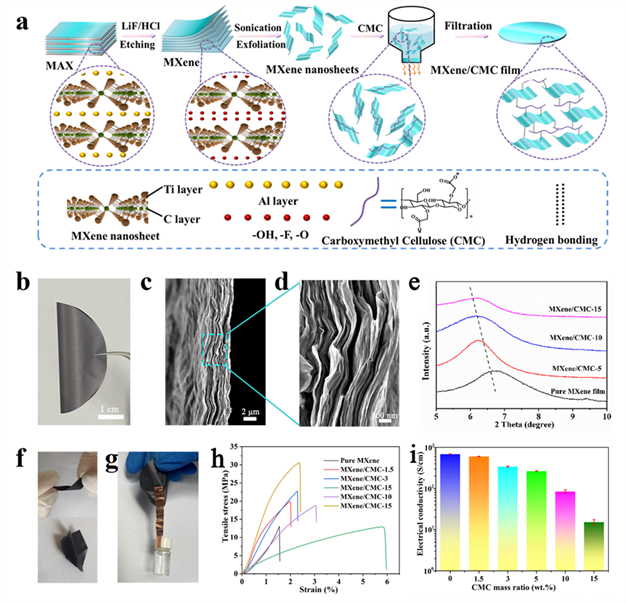 为了实现超级电容器的高柔韧性,设计高导电和高柔性电极尤为关键。在这项工作中,利用链柔性的CMC与具有金属导电性和大比表面积的二维纳米材料MXene相复合,制备了MXene/CMC薄膜电极。CMC与MXene纳米片间的强分子间相互作用及柔性有效提高了MXene/CMC薄膜的机械柔韧性。拉伸机械测试表明所制备的MXene/CMC薄膜具有5.9%的应变及12.7MPa拉伸强度,同时电化学测试证明其仍保持了高电导率(267 S/cm)。这种同时具有高柔性和导电性的薄膜是制备柔性超级电容器的理想材料。