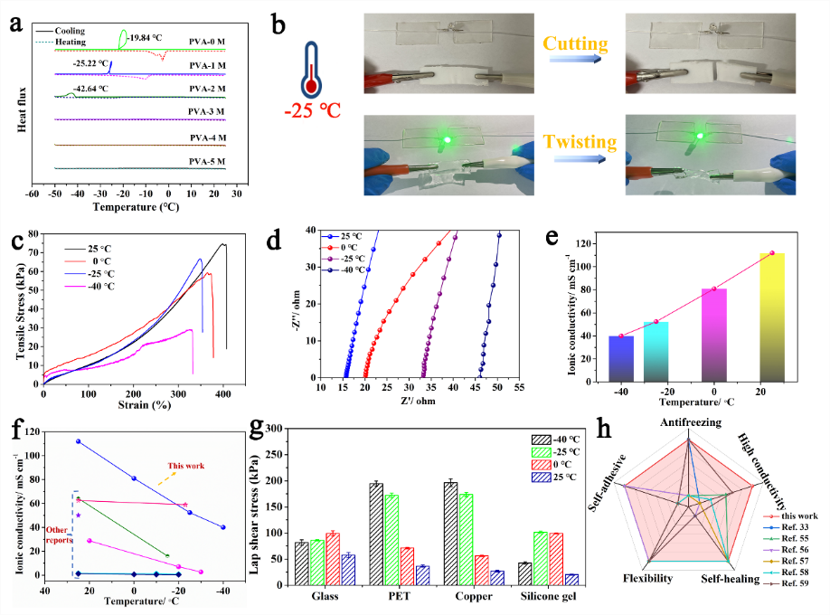 此外,设计多功能水凝胶电解质对于获得柔性超级电容器极为重要。在此,我们利用电解质盐LiCl调控PVA链、水分子及盐离子之间的相互作用,通过简单的冻-融过程制备了多功能PVA/LiCl水凝胶电解质。由于盐析效应,Li+和Cl−能够有效地与PVA链上的-OH结合,降低PVA链间的结晶度,使得水凝胶表现出高拉伸性和低的弹性模量,拉伸测试证实了其类皮肤机械性能。同时低交联密度,使得聚合物链的运动性增强,并且在凝胶暴露出更多的活性官能团,因此水凝胶还展现出自愈合性及与各种基材(包括电极材料)的强粘附性。此外,Li+ 可以与 H2O 分子强烈作用形成水合离子,赋予PVA/LiCl优异的抗冻特性。拉伸、剪切拉伸及交流阻抗测试表明此水凝胶在-40℃仍保持其高拉伸性、高离子导电性及自黏附性。