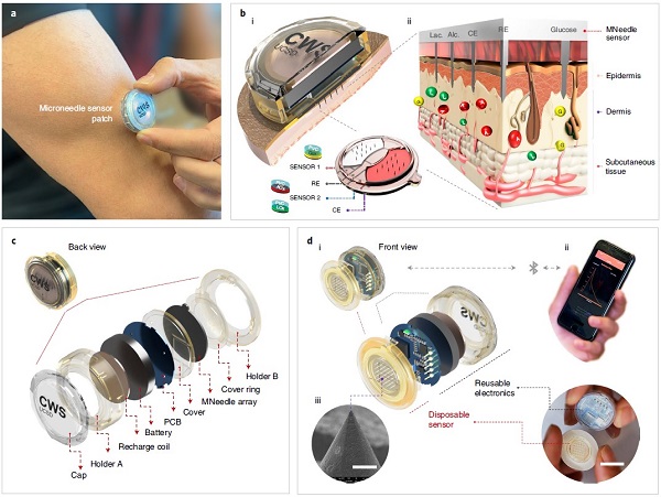 加州大学圣地亚哥分校Joseph Wang教授和Patrick P. Mercier副教授(共同通讯作者)等人发表文章报告了一种小型化、全集成、无线操作的微针技术,可用于持续监测行为自由人体的ISF生物标记物。这一可穿戴系统通过不断收集丰富的分子数据,以便于更好地了解身体对日常活动的反应。ISF生物标记物(葡萄糖、乳酸和/或酒精)的实时监测可单独(单个分析物)或者同时(葡萄糖-酒精和葡萄糖-乳酸)进行,其结果与相应金标准(血液或呼吸)测量结果呈现出密切相关性。为了实现这一目标,该研究设计、制造、开发并测试了一个全集成微针传感器系统,该系统由多个传感探头和定制电子器件组成。其中,集成系统具有九个不同的子组件,它们被组装成两个主要组件——“一次性传感器”和“可重复使用的电子器件”,以便根据功能寿命方便更换低成本一次性传感器组件。该系统微针尖端插入皮肤上皮后,可持续选择性地收集来自佩戴者ISF的分子级电化学信号,该信号紧接着通过电子器件的低噪、可重复使用的传感器-器件物理接口无线传输到佩戴者的移动应用程序并进行可视化和分析。由此,研究通过整体性方法解决了系统集成(传感器、电子设备、固件和app开发)、制造、皮肤穿透以及准确无串扰的生物传感等多方面的挑战。加州大学圣地亚哥分校Farshad Tehrani、Hazhir Teymourian、Brian Wuerstle、Jonathan Kavner为本文共同第一作者,研究成果以 “An integrated wearable microneedle array for the continuous monitoring of multiple biomarkers in interstitial fluid”为题发表在国际著名期刊Nature Biomedical Engineering上。