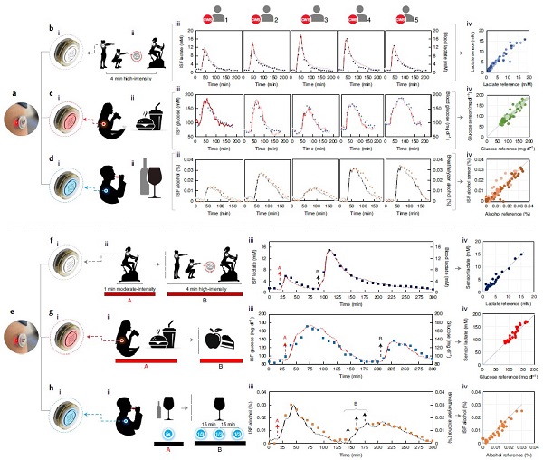(a)酒精-葡萄糖传感器在先饮酒(iA)后饮食(iB)过程中的性能研究,(ii)相应的ISF酒精和葡萄糖数据,(iii)ISF数据与金标准数据的比较;