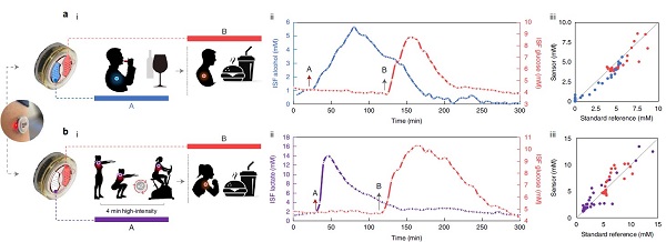 (b)乳酸-葡萄糖传感器在先进行4分钟高强度训练(iA)后饮食(iB)过程中的性能研究,(ii)相应的ISF乳酸和葡萄糖数据,(iii)ISF数据与金标准数据的比较。
