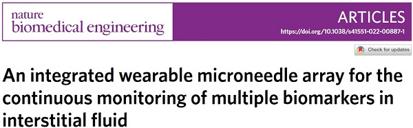 文献链接:An integrated wearable microneedle array for the continuous monitoring of multiple biomarkers in interstitial fluid, Nat. Biomedical Engineering, 2022, DOI: 10.1038/s41551-022-00887-1.