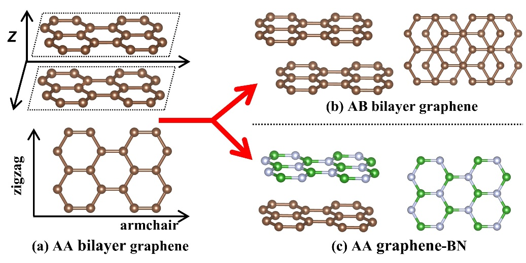 图1:(a) AA堆叠石墨烯,(b) AB堆叠石墨烯和(c)AA堆叠石墨烯-BN异质结结构示意图。