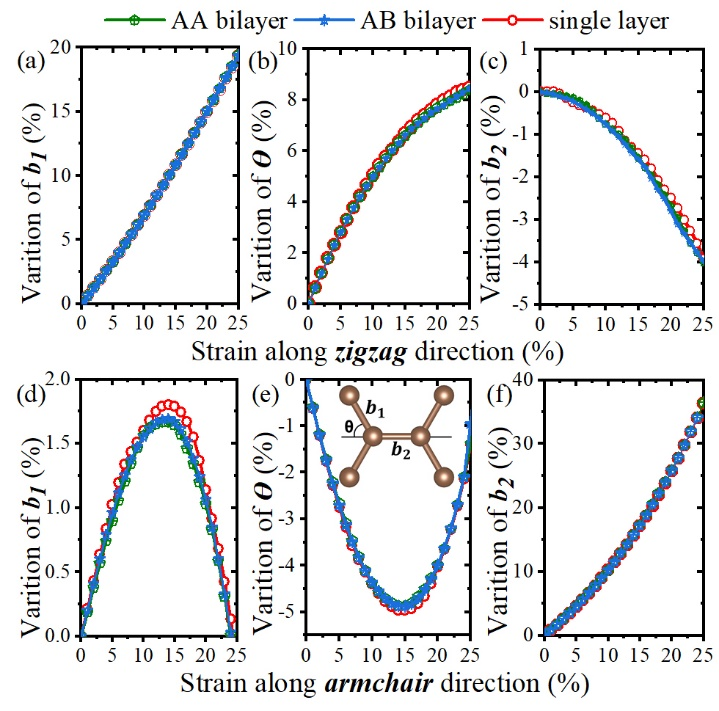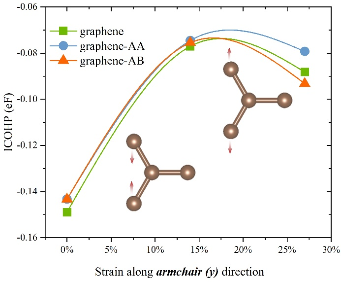 在armchair方向施加应变时,在NPR发生之前,ICOHP值不断增加,面内相互作用的约束变弱。当相互作用强度达到最弱时,石墨烯不再保持zigzag方向的收缩,导致键角θ变大。通过比较单层石墨烯和AA堆叠、AB堆叠双层石墨烯,我们发现它们的ICOHP值变化略有差异,这也导致了几何变化略有差异