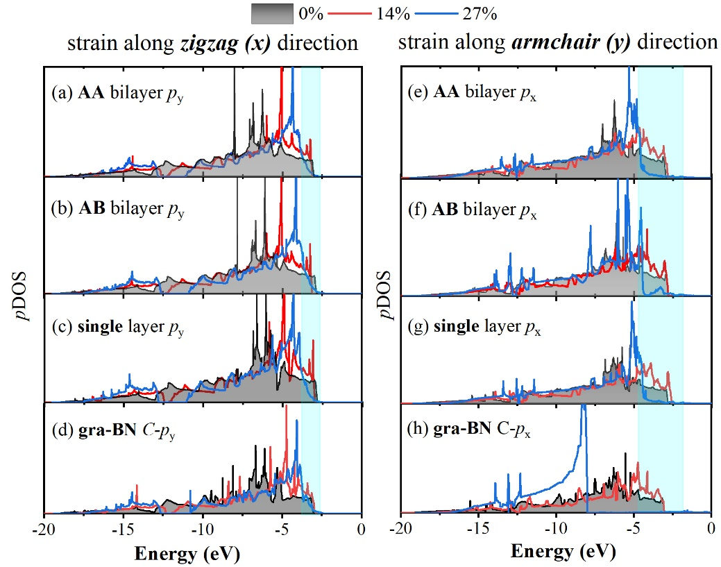 在armchair方向施加应变,靠近价带最大值的四种材料的px-DOS先略有增加后显著减小,说明沿zigzag方向的相互作用力大幅度减小,导致结构键角异常增大,这是造成NPR的基本变化。而在应变沿zigzag方向时,接近价带最大值的四种材料的py-DOS变化较小,几乎是单调下降的,这可能导致这种情况下结构几何参数和泊松比出现单调变化。