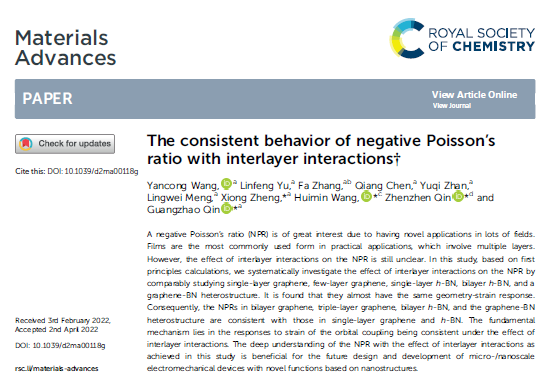 Yancong Wang, Linfeng Yu, Fa Zhang, Qiang Chen, Yuqi Zhan, Lingwei Meng, Xiong Zheng*, Huimin Wang*, Zhenzhen Qin*, and Guangzhao Qin*. The consistent behavior of negative Poisson’s ratio with interlayer interactions, Materials Advances, DOI:10.1039/D2MA00118G (2022)