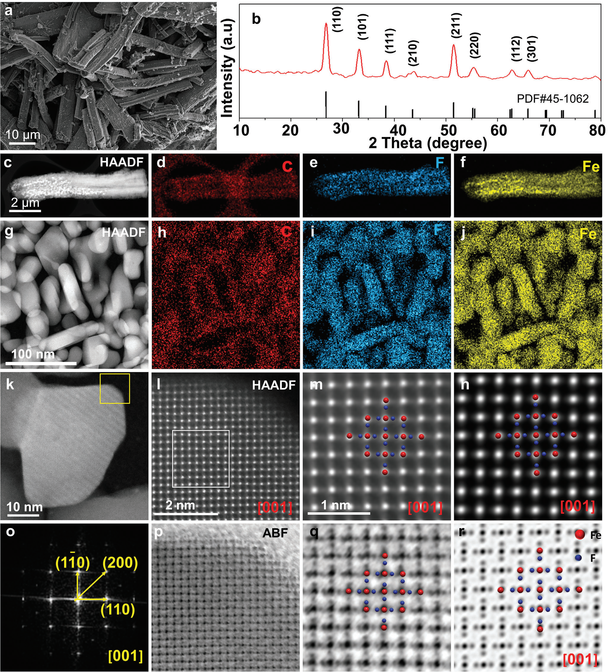 q)对应于(m)的高倍ABF图像,显示每个 Fe 原子被四个F原子包围,具有两个较长和两个较短的键。
