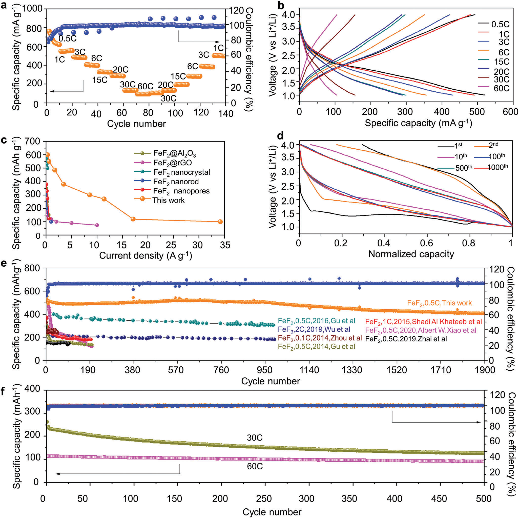 a)FeF2@PDC正极的倍率性能从0.5 C到 60 C (1 C = 571 mAh g–1)