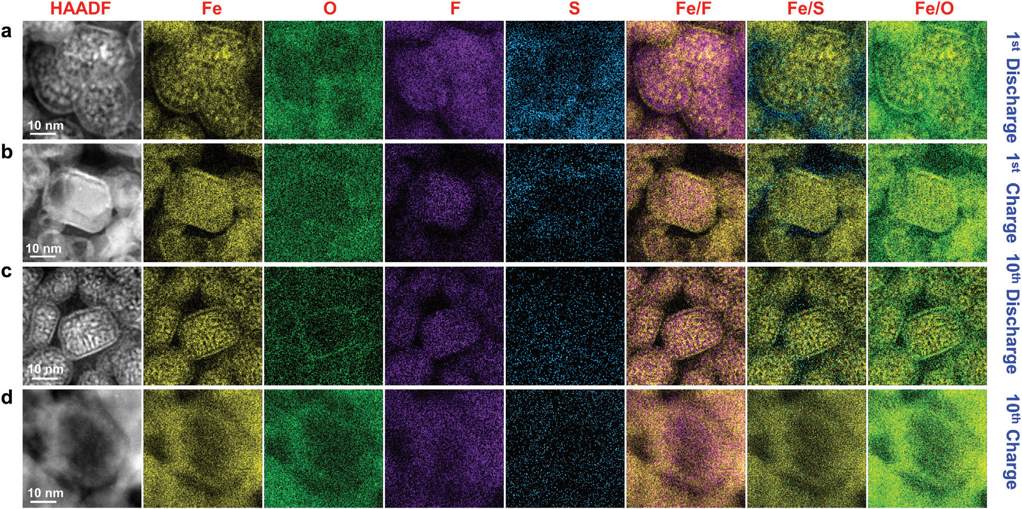 c)第10次放电和d)第10次充电。Fe、O和F的分布分别与第一次放电和充电循环中的分布相似