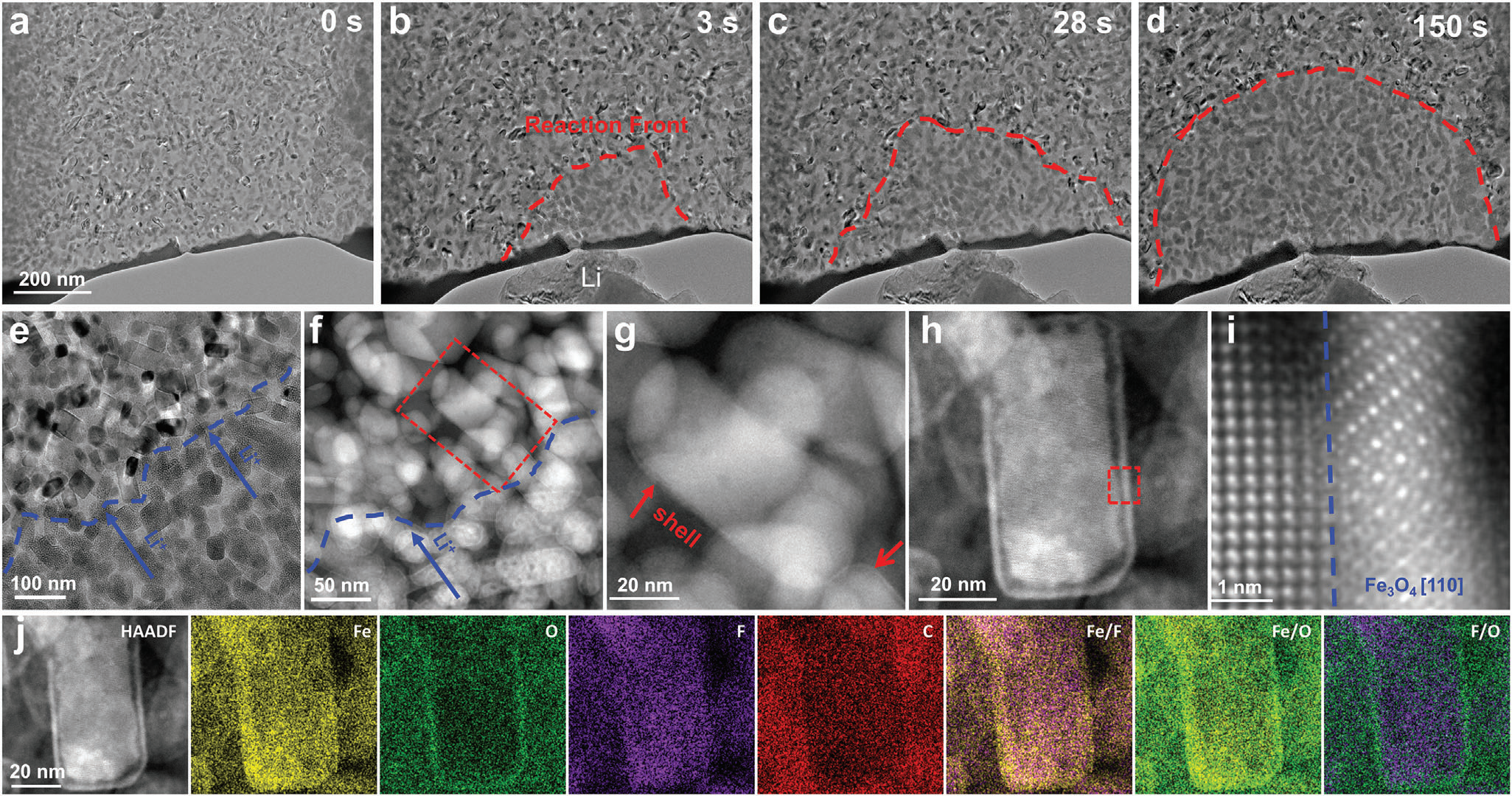 b) 在放电过程中,FeF2转化为相互连接的斑点状Fe纳米颗粒(亮对比),LiF(暗对比)在其间交错