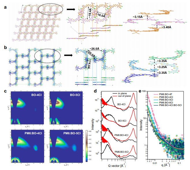 除了它们的分子结构外,NFAs的堆积行为也被证明对决定其光电性能和OSC性能起着关键作用。首先分析了BO-4F、BO-4Cl和BO-5Cl单晶的分子堆积特性。从单晶生长的详细情况看出,这些分子形成了具有三维堆积特征的有序结构。然而,如图2a所示,不同的端基导致不同的分子堆积模式。对于所有这些NFA,核心外环上的S原子与端基上的O原子之间的距离在2.60-2.70 Å范围内。这种O…S非共价相互作用导致良好的平面性,有利于在相邻分子之间形成有效的传输通道。鉴于分子的大小几乎相同,观察到更多分子堆叠在相同的体积中,如图2a所示,表明BO-4Cl中的堆叠变得更加密集。在BO-5Cl(图2b)的情况下,堆叠网络类似于BO-4F,相邻分子之间的距离从3.4略微减小到3.3 Å,堆叠柱之间的距离从30.0减少到26.0 Å。