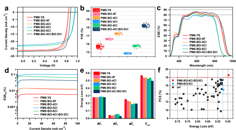有机光伏(OPV)是一种新兴技术,在可再生能源方面具有巨大潜力,由于有机材料的特殊优势,如柔韧性、低成本、选择性吸收可见透明、鲜艳的色彩等。在分子设计、形貌控制、界面工程、器件结构等方面的综合努力下,目前创纪录的功率转换效率(PCE)已达到19%,接近商业化应用的要求。然而,有机光伏的PCE仍然低于无机材料,例如硅(PCE高达26.7%)或GaAs(29.1%),这主要是由于较大的开路电压(Voc)损失对有机太阳能电池(OSCs)造成不利影响(最先进的PM6:Y6系统Voc损失约为 0.55 eV)。