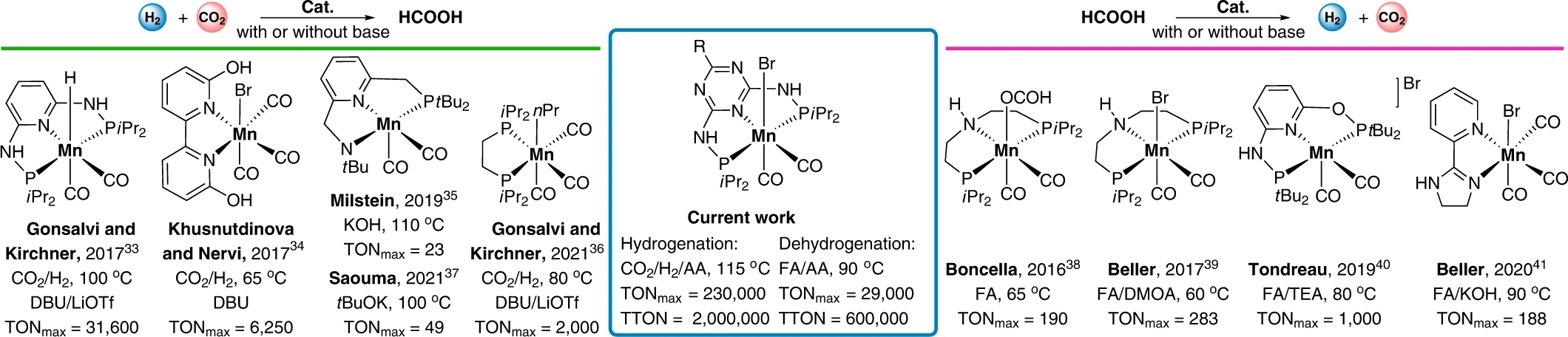 图 2 均相 Mn 配合物应用于CO2加氢生成甲酸(FA)及其脱氢反应 © 2022 The Authors