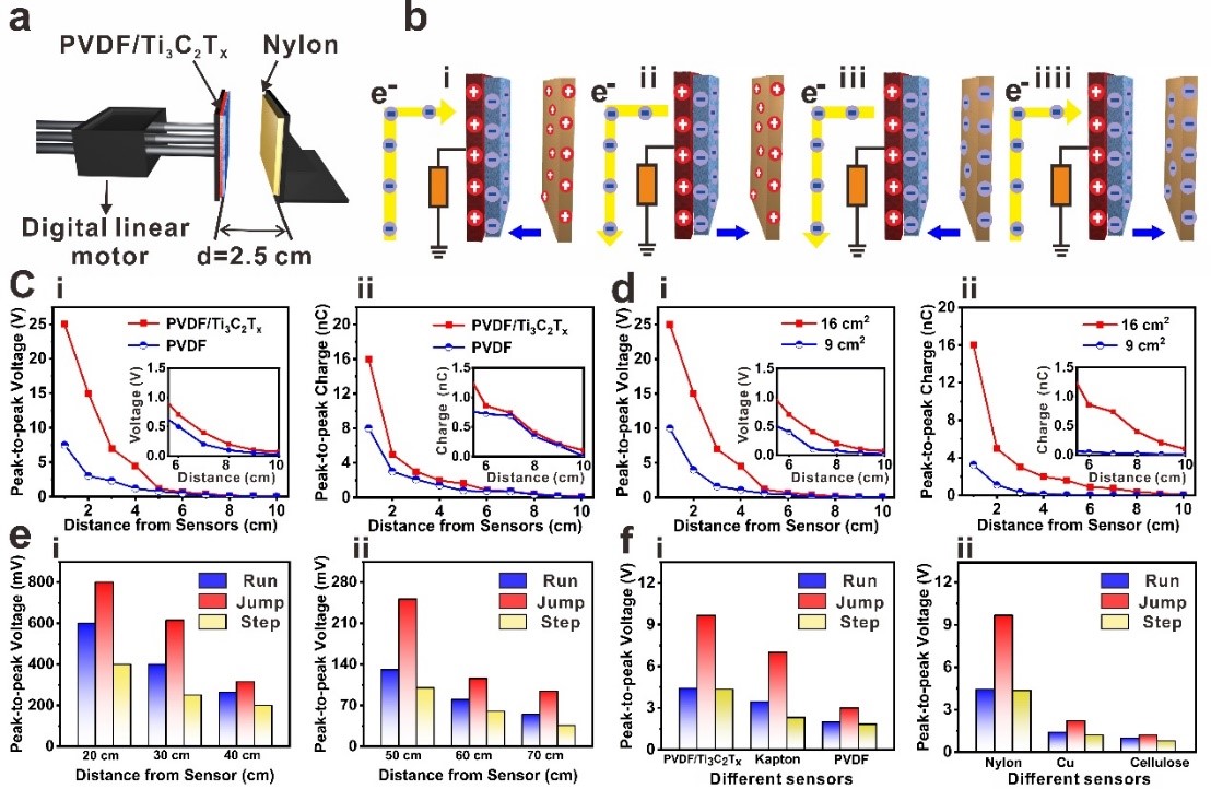 图4. 传感器设计及工作原理。a) 初步表征的实验装置。b) 由带正电或负电的物体移动而产生的电流。c) PVDF@Ti3C2Tx传感器距离变化引起的电压和电荷输出。d) PVDF@Ti3C2Tx传感器面积变化导致的电压和电荷输出。e) 不同活动和距离的电压输出。f) 不同摩擦电材料的电压输出。