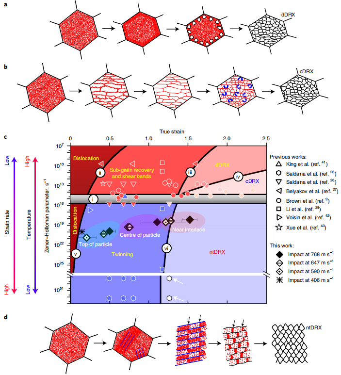图1 DRX过程中组织演变的变形图和示意图.a,b DDRX过程中随着应变增加,微观结构的演变示意图,晶核和随后的生长是在优先位置(如晶界附近)密集位错的损失下发生的,在cDRX过程中,随机分布的位错引起拉长的位错胞,然后这些位错细胞分裂并旋转形成相当等轴的晶核(b). (c) 显示了铜的预期变形机制作为真应变和Zener-Hollomon参数Z的函数;晶粒尺寸为20 μ m时,将微观结构场的边界标为i-vi. (d) 图中显示了ntDRX的演变顺序,这里提出的机制是孪晶成核、生长,然后分裂成等轴纳米尺寸的晶粒。黑色、红色和蓝色(分别为a、b、d)分别代表晶界、位错和孪晶界。