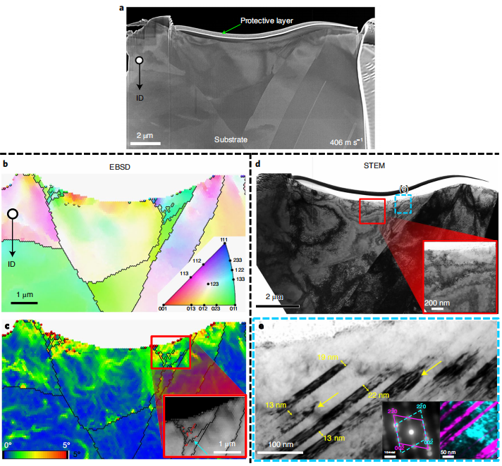近日,麻省理工学院Ahmed A. Tiamiyu等人利用激光诱导粒子冲击试验机,使用单个铜微粒冲击事件来获得应变和应变速率的极端条件。利用电子背散射衍射和扫描透射电子显微镜相结合的方法对撞击点进行测试实验后表征。本工作系统地探索了应变水平的增加,并观察到纳米孪晶促进的再结晶过程。称之为纳米孪晶辅助动态再结晶。它比已建立的再结晶模式获得更细的晶粒尺寸,这为通过极端应变过程获得最细的纳米晶粒尺寸提供了途径。相关成果以“Nanotwinning-assisted dynamic recrystallization at high strains and strain rates”为题发表在材料学顶级期刊《Nature Materials》上.
