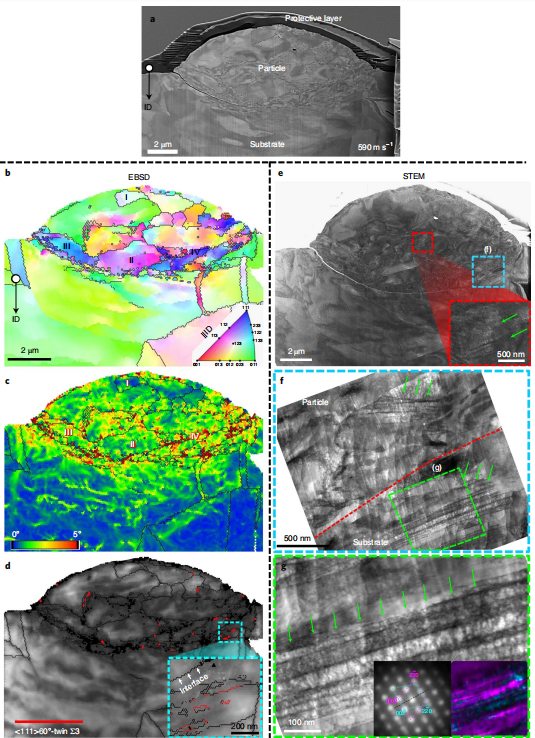 图3 对轻微变形黏附颗粒的撞击点的表征;(a) 扫描图像;(b)IPF图;(c)KAM图; (d) BC图;其中插图为放大图像,突出显示孪晶界;e – g, STEM明场像显示了在颗粒顶部位错滑移的变形,在颗粒高位错密度区域和基体附近的孪晶; b-d,黑线表示大于15°的大角晶界; f,红色虚线方框为颗粒-基体界面。e,f,箭头表示纳米孪晶结构。g,衍射盘强度的集成的虚拟暗场像(右)形成,以突出孪生结构。