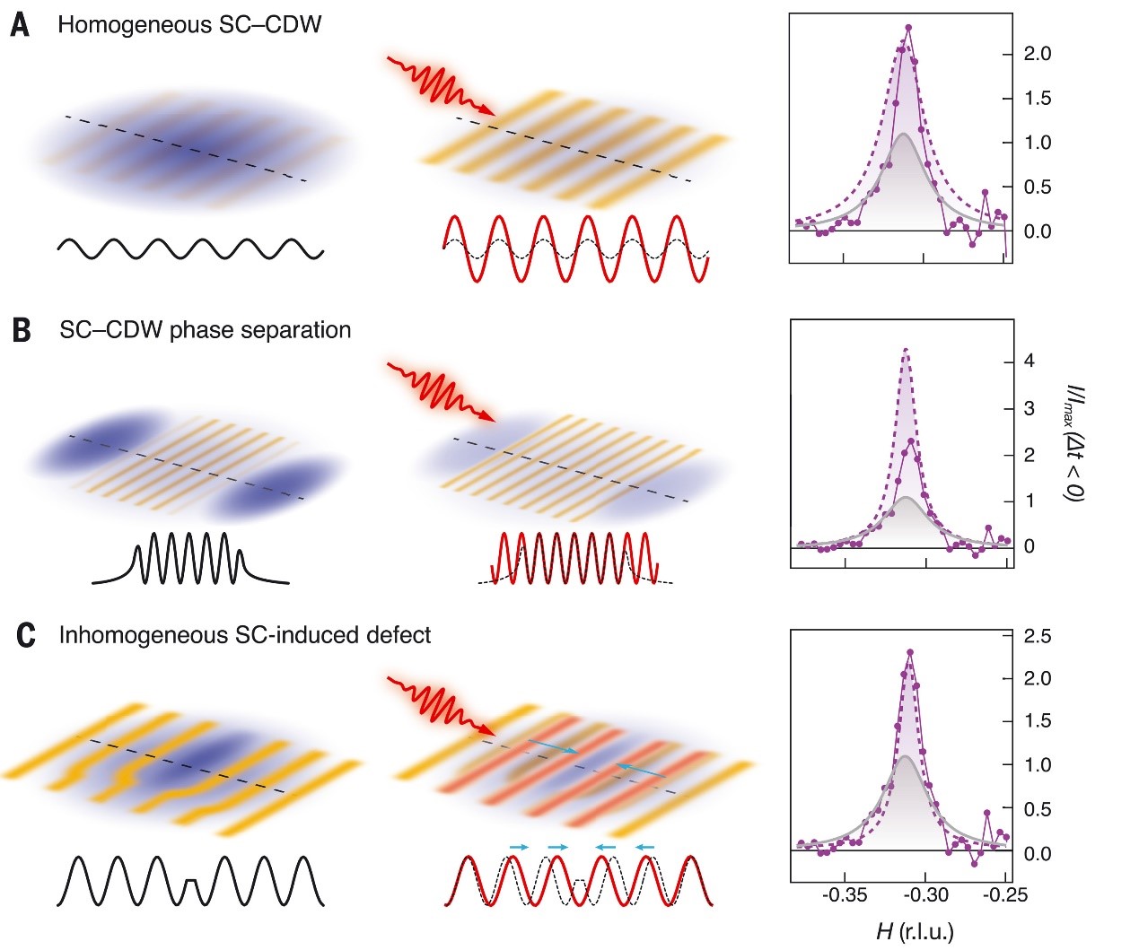 近日,美国 SLAC国家加速器实验室Giacomo Coslovich团队在超导性和电荷密度波之间发现了一种新的关联。通过在YBa2Cu3O6+x上进行时间分辨共振软X射线散射研究,跟踪CDW对红外激光脉冲驱动的超快超导猝灭的响应揭示了超导和CDW 在时域中的相互作用。通过对超导猝灭后YBa2Cu3O6+x中CDW关联性的瞬态演变的研究,观察到CDW序的非热响应,其特征是在超导猝灭的约1皮秒内关联长度几乎增大了一倍。这表明超导性稳定了CDW缺陷,这些缺陷通过抑制超导性而被消除。这个结果与模型一致,其中超导性和 CDW之间的相互作用通过破坏空间相干性表现出不均匀性,而超导性在稳定CDW拓扑缺陷方面起主导作用。将YBa2Cu3O6+x暴露在红外光下来降低YBa2Cu3O6+x的超导性时,材料的电荷密度波会增加,并以更均匀、同步的模式组织起来。相反,当超导性增加时,材料的电荷密度波变得不那么有条理。这基本上找到了一个‘调谐旋钮’,可以通过增加或减少超导性来改变电荷密度波的形状。这项研究对于扭转这一过程并找到通过电荷密度波改变超导性的方法提供了重要参考。相关成果以“Enhanced charge density wave coherence in a light-quenched, high-temperature superconductor”为题发表在知名期刊Science上。