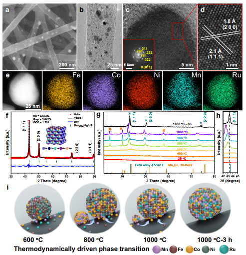 图2. FeCoNiMnRu/CNFs的形貌和结构表征。
