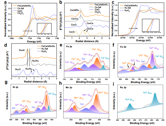为了研究FeCoNiMnRu/CNFs的化学状态和表面组成,作者分别进行了X射线吸收光谱(XAS)和X射线光电子能谱(XPS)表征,如图3a,c,相比于对比样,Co K-edge和Ru K-edge的X射线吸收近边结构(XANES)表明二者均以金属态存在于HEA中,但HEA中的Co和Ru的post-edge与金属Co和Ru的轮廓和强度不同,表明HEA以合金形式存在,傅里叶变化的扩展X射线吸收近边结构(FT-EXAFS)也证实HEA中Ru和Co的平均键长是相当的,均不同于金属中的Co和Ru。