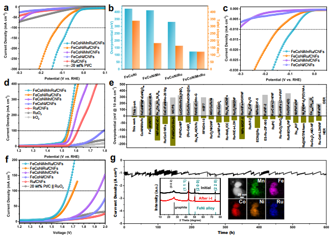 (g)FeCoNiMnRu/CNFs电极在−1.16 V vs. RHE电位下稳定运行600 h,插图为稳定性测试后的XRD图谱和能谱mapping图像。