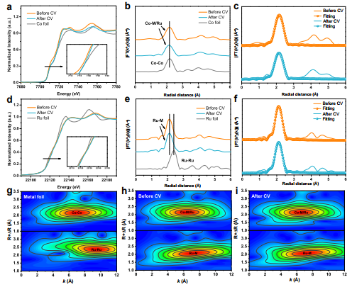 (g)金属箔和稳定性测试前后的(h,i)FeCoNiMnRu/CNFs中Co和Ru的小波变换EXAFS光谱。