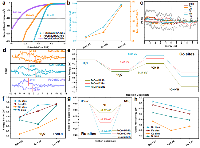 有鉴于此,江南大学的朱罕等人采用静电纺丝结合高温碳化工艺合成了一系列FeCoNiXRu(X:Cu,Cr,Mn)HEA纳米颗粒电催化剂,理论和实验证实该HEA体系具有两种活性位点,可以有效吸附H2O解离和H2生成过程中的中间体OH*和H*,此外作者证实可以通过调节组分的电负性来优化HER活性(图1d,e),为在HEA上构建多组分活性位点用于不同的中间体反应提供一个思路。