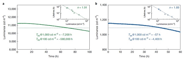 3.抑制电子泄漏可显著改善蓝/绿色QD-LEDs的电荷载流子-发射激子转换效率(约为100%)、稳定性(绿色QD-LEDs在100尼特初始亮度下的T95寿命为58万小时,蓝色QD-LEDs则为超过4千小时)等器件主要性能。