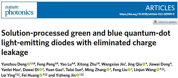 文献链接:Solution-processed green and blue quantum-dot light-emitting diodes with eliminated charge leakage, Nat. Photonics, 2022, DOI: 10.1038/s41566-022-00999-9.