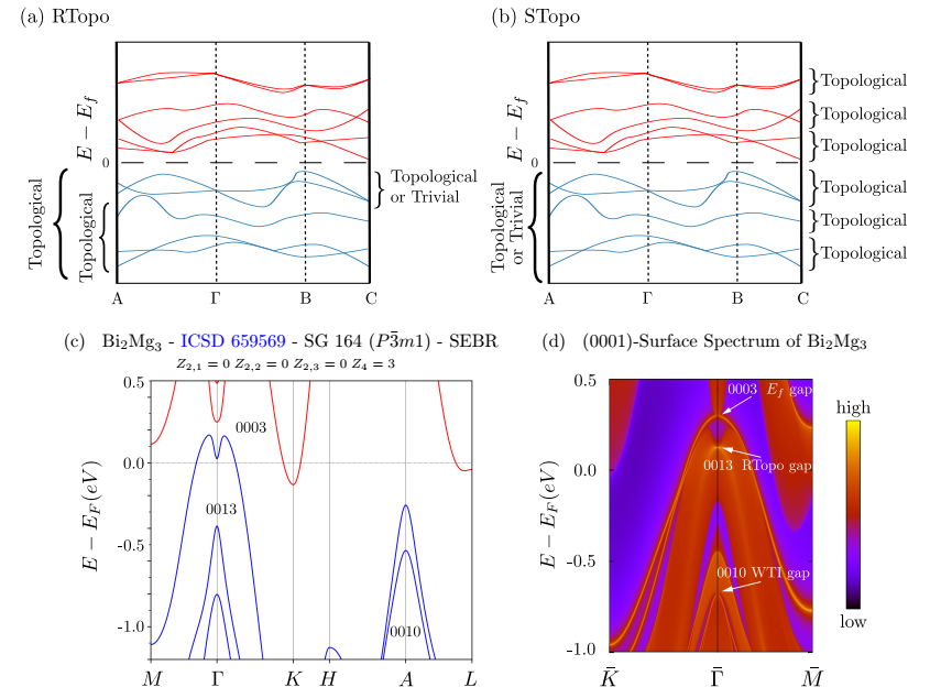 近日,美国普林斯顿大学Nicolas Regnault团队联合西班牙国际物理中心Maia G. Vergniory、麻省理工学院Benjamin J. Wieder等学者,在Science上报道了费米能和远离费米能处全能带中稳定和脆弱相拓扑结构的目录,将ICSD升级为可用的拓扑材料数据库。在化学计量材料ICSD的96,196可处理的条目中计算了所有能带的电子结构,拓扑类,对称性指标。根据常见的化学式、晶体结构和拓扑结构,将其归类为38,298种独特的材料。从而完成了已知非磁性材料的对称带拓扑结构,使得拓扑材料目录中可及的材料比之前多了一倍。通过高通亮计算,研究发现了一类新型拓扑材料的存在,即重复拓扑(RTopo)材料,在EF处具有能量隔离脆性带的强化拓扑半金属,在EF处及其下方具有稳定拓扑绝缘间隙;超拓扑(STopo)材料,其中的STopo材料核壳之上的每一个能量孤立的带集都是稳定的拓扑。研究结果将先前拓扑材料的几个实验研究重新背景化(DOI: 10.1038 /s41586-019-0954-4 ,DOI: 10.1038/s41586-022-04519-1)。研究发现,先前分别显示为激子绝缘体相和电荷密度波相的过渡金属硫族化合物SG 15 (C/2c) Ta2NiSe5和SG 12 (C2/m) Ta2NiSe7是正常状态下的三维拓扑绝缘子(TIs)。此外,研究还发现SG 166 TI菱面体铋和SG 16间接能隙TI Bi2Mg3 都是 RTopo和STopo材料。先前对Bi2Mg3的ARPES研究已经证实 EF以下存在“表面共振带”,在这项工作中,发现表面共振带实际上是RTopo Dirac-cone平面态。计算表明,在EF处,52.65%的材料是拓扑的,大概2/3能带中所有材料都表现出对称的稳定拓扑结构,令人震惊的是,87.99% 的材料至少含有一个稳定的或脆弱的(晶体)拓扑带。