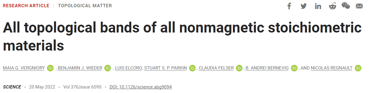 All topological bands of all nonmagnetic stoichiometric materials,DOI: 10.1126/science.abg9094