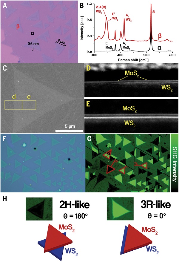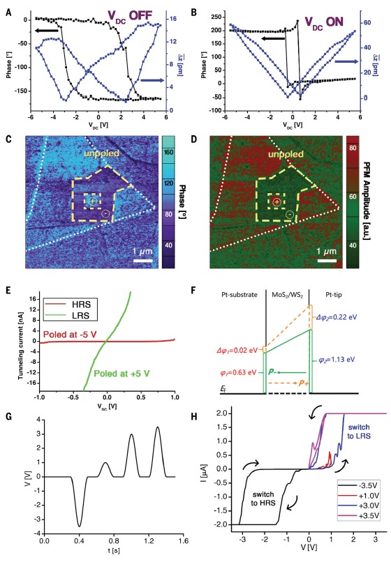 近期,香港理工大学的刘树平、中国人民大学的季威和剑桥大学的Manish Chhowalla(共同通讯作者)等人合作发表了最新工作,在通过可规模化的一步化学气相沉积(CVD)策略合成的无扭曲、相称(commensurate)和外延MoS2/WS2异质双层中,意外观测到了OOP铁电性和压电性。研究显示,该双层的d33压电常数为1.95-2.09皮米/伏,比单层In2Se3的自然OOP压电常数还要大6倍左右。通过改变MoS2/WS2异质双层的极化状态,研究还证明了相应铁电隧道结器件中隧穿电流可进行约三个数量级调制的行为。进一步的密度泛函理论显示,一步化学气相沉积策略可交替堆叠MoS2/WS2层,从而可在无需扭曲角或者摩尔畴的前提下进行对称打破和层间滑动,最终获得铁电/压电性能。香港理工大学的Lukas Rogée和中国人民大学的Lvjin Wang为共同第一作者,2022年5月26日,相关成果以题为“Ferroelectricity in untwisted heterobilayers of transition metal dichalcogenides”的文章发表在Science上。