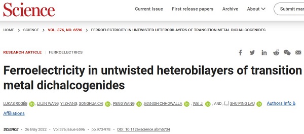 文献链接:Ferroelectricity in untwisted heterobilayers of transition metal dichalcogenides(Science, 2022, DOI: 10.1126/science.abm5734)