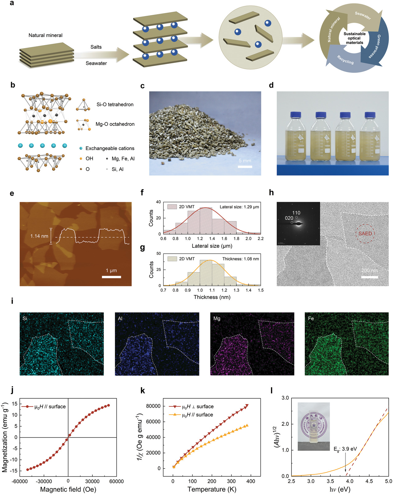a)二维VMT绿色生产示意图。b)二维VMT的原子结构: 由交替堆叠的MgO八面体和SiO四面体构成。c) VMT原料照片。d)以升为单位的二维VMT分散体。e)沉积在基底上的二维VMT原子力显微镜图像。f,g)晶体横向尺寸统计(f)和厚度统计(g)。h)单层VMT的典型透射电镜图像和选区衍射图(插图)。i) Si、Al、Mg和Fe的能量色散x射线图。j) 二维 VMT层压板在5 k时的面内磁化率。k)在0.1 T时,层压板的面内和面外逆磁化率随温度变化的函数。l) 二维VMT的Tauc图。插图:二维VMT水分散体在10毫米厚比色皿中的光学图像,说明VMT分散液的透明度。