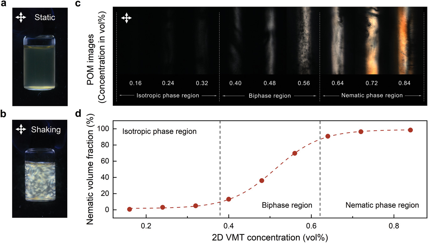 a)浓度为0.16 vol%的二维VMT分散液在静态下的光学图像。b) 浓度为0.16 vol%的二维VMT分散液在摇动时的流动诱导双折射图像。(a)和(b)两种情况下都使用了交叉偏振器。c)含有不同浓度VMT分散液的毛细管(直径1.0 mm)的光学图像。浓度为0.64、0.72和0.84 vol%的分散液具有明显的双折射区域,呈现为向列相。浓度低于0.32 vol%的分散液无双折射,呈现各向同性。浓度在0.40、0.48和0.56 vol%之间的分散液处于双相状态。d)向列相百分数与VMT浓度的函数关系。
